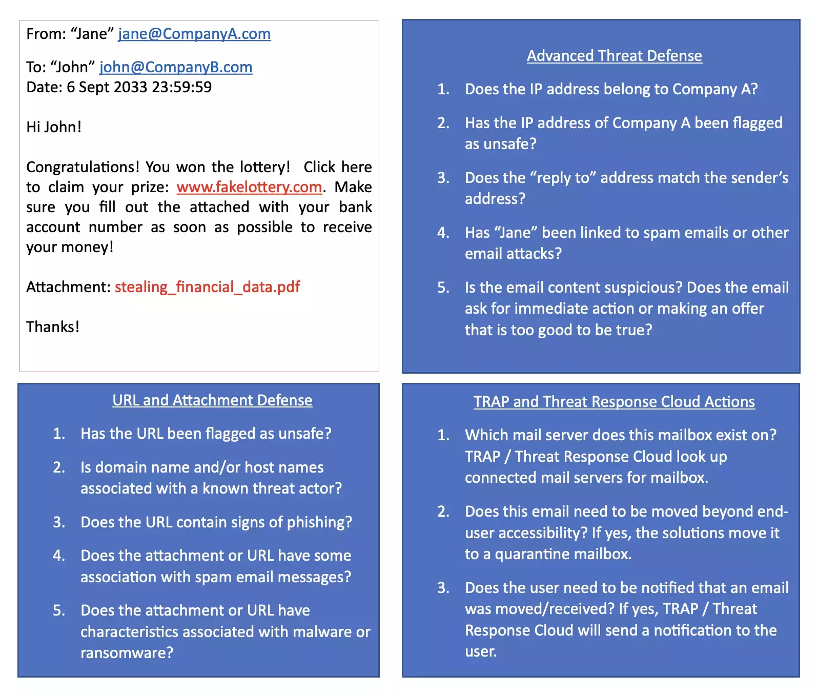 The following is an example of a dangerous email that could be sent to your employees. Utilizing data aggregated by alert sources, TRAP and Threat Response Cloud identify the malicious content found in the email and remove it from the original recipient’s mailbox as well as any mailboxes to which it was forwarded. The text in the blue boxes is representative of the steps taken by TRAP and Threat Response Cloud using information received from any source of alerts. It is not a comprehensive review.