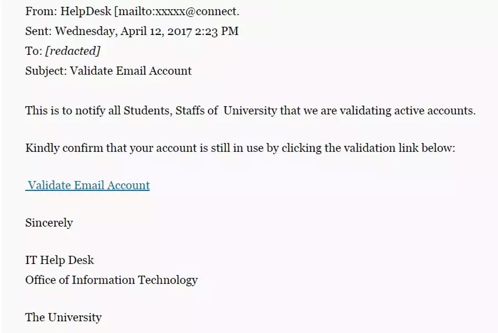 Voici un exemple de courrier électronique reçu par les utilisateurs de l’université américaine de Cornell. Il s’agit d’un simple message qui indiquait “Help Desk” comme nom de l’expéditeur (bien que le courriel ne provienne pas du service d’assistance de l’université, mais plutôt du domaine @connect.ust.hk).
