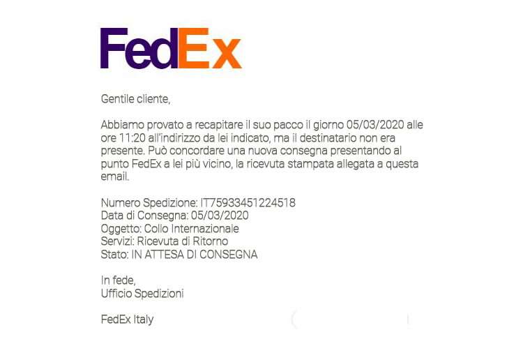 Voici un exemple de texte d’email de phishing partagé par l’expéditeur international FedEx sur son site web. Ce courriel encourageait les destinataires à imprimer une copie d’un reçu postal joint et à l’apporter dans un centre FedEx pour récupérer un colis qui ne pouvait pas être livré.