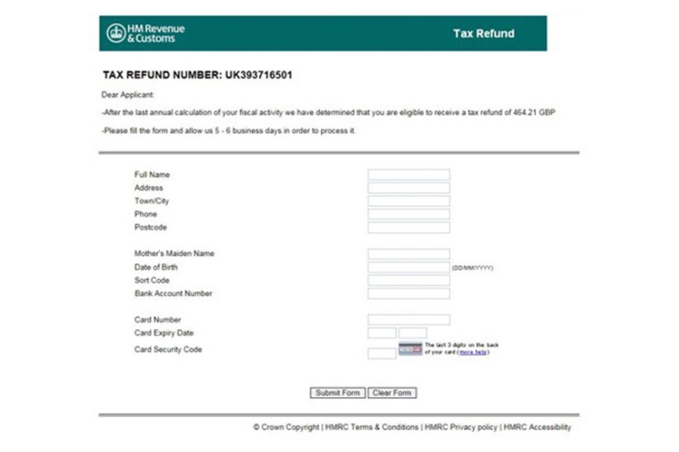 Voici un exemple de fausse page d’accueil partagée sur le site web gov.uk. Après avoir cliqué sur un lien dans un email de phishing, les utilisateurs sont dirigés vers cette page frauduleuse qui semble faire partie de l’agence de recouvrement des impôts HMRC.