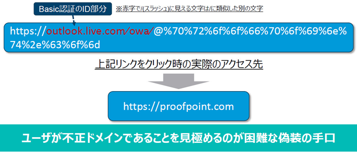 まず、プルーフポイントで確認された新しい手口のフィッシングメールを紹介します。これは銀行になりすましたメールで、リンク先を確認すると赤線の部分は正規のドメインのように見えます。しかし、実際にアクセスするのは「@」以降です。この部分はエンコードされた不正ドメインになっているのです。
