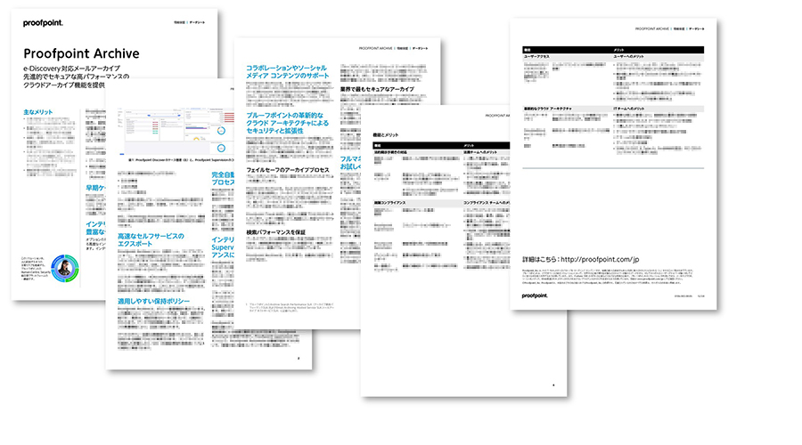 データシートにアクセスするには、以下をクリックしてください ダウンロード Proofpoint Archiveは、法的開示手続き、規制コンプライアンス対応、そしてユーザーのデータアクセスを簡素化する、クラウドベースのアーカイブ ソリューションです。非常に多くの種類のコンテンツに対応できる、検索可能な中央リポジトリとして機能します。 プルーフポイントのフルマネージド サービスを利用すると、社内のメールアーカイブを簡単に管理できます。